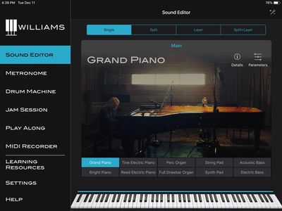 The Williams Piano app for iOS (iPhones and iPads) devices adds control and play-along features to the Williams Legato III and Allegro III. Connect over Bluetooth Wireless MIDI to your iPhone or iPad to select, layer, and edit sounds on the piano. A collection of internal effects can be added to the built-in sounds of the Legato III and Allegro III, like Tremolo, Flanger, Delay, Reverb, and Chorus.